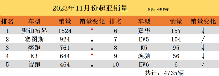 赛图斯、奕跑与K3的销量也都超过了500台,它们分别卖出了924辆、761辆以及644辆,这其中赛图斯与K3都是被起亚寄予厚望的新车型,不过今时不同往日,就如K3,同级别的轩逸、朗逸都在降价促销,再加上国产的秦PLUS DM-i等车型的竞争,这个市场已经没有它的位置。