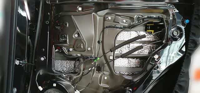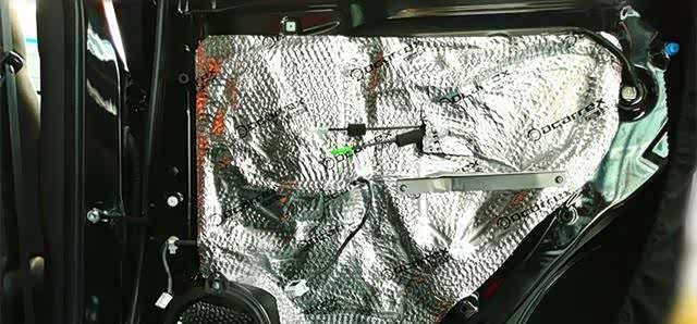 开始在车门内侧贴好丁基橡胶材质的隔音减振板,起到削减车门共震,削减车外噪声传入车内的好处,同时也加强的车门的钣金强度。
