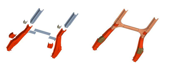 大型零件的不同区域对性能有着不同要求,以往常用的点焊工艺已无法满足不同类型以及厚度的材料之间的连接要求。因此一体式后车体骨架采用激光拼焊工艺,将最合适的材料用在最合适的地方。相对于基准方案的传统点焊结构,一体式后车体骨架通过激光拼焊将原来的134个焊点减少到0,节省了分总成的焊装、人工、物流、机器人等成本投入。