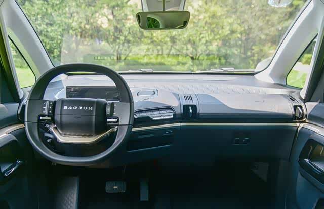 内饰的造型和外观呼应得很不错,中控台的布局是类似海湾形,主驾一侧向外突出,而副驾一侧中控台内收。中控台细节造型布局简洁干练,车辆信息和车机系统都整合到了液晶仪表盘当中,中控台中间有少量的钢琴按键式的实体按键。方向盘的造型很别致,类似于方矩形。