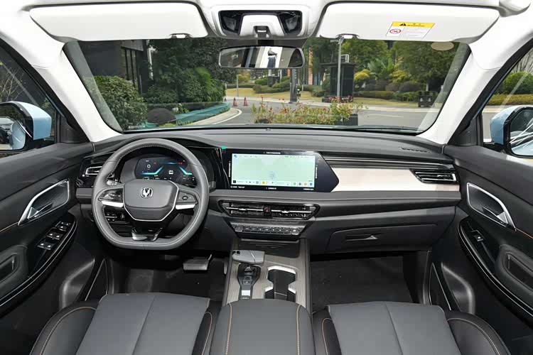 第二代长安X7 PLUS的内饰同样延续了欧尚X7 PLUS的设计,中控台偏向驾驶者一侧,只是多功能方向盘换成了V字Logo,液晶仪表、中控屏以及电子挡杆都有配备,将提供黑色和棕色内饰配色。