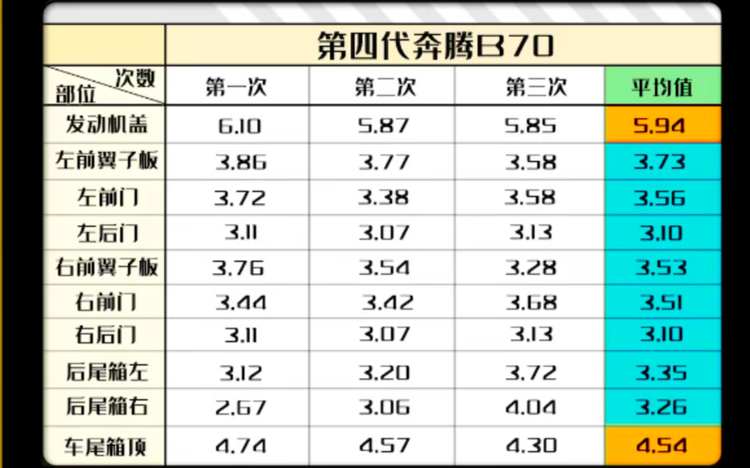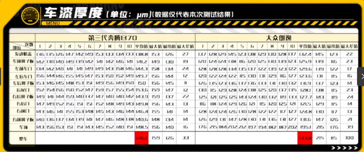 本次拆解在车身的所有钣金件上各自选择了10个样品点位,进行检测对比,综合来看,第四代奔腾B70的漆面厚度最大值为159μm,最小值为126μm,最大差值为33μm,整车平均厚度为146.1μm。作为对照组的大众朗逸,平均值为133.8μm,最大差值为100μm,可以说相较合资品牌车型,第四代奔腾B70在漆面厚度以及均匀程度上都存在一定优势。