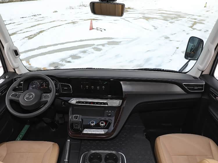 内饰方面,前排驾驶舱部分的设计风格简约稳重。主驾位置可以看到双辐多功能方向盘、机械表盘+4.2英寸彩显行车电脑、10.25英寸中控触屏、娱乐主机系统(麦克风接口+双USB+收音机)、电子挡杆、电动冷暖空调、独立式扶手等配置。旗舰版二排领导座还配有带杯架的办公桌、220V电源,另一侧则可以看到35L车载冰箱、隐藏式雨伞架、空气净化器、折叠秘书桌等。除最后一排外,所有后排座椅均支持靠背角度调节,并带有过道侧独立扶手和三点式安全带。