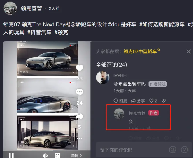 其实,领克07 EM-P的相关消息最早可追溯到2023广州车展前,当时一个名为领克管管的用户在某音上发布了“领克07 领克The Next Day概念轿跑车的设计”相关内容。随后该用户更是在评论区回复网友道今年会出新车。