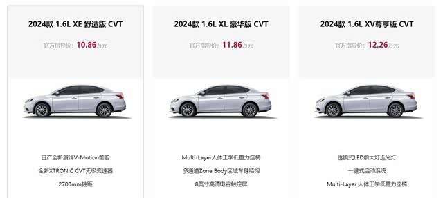 2024款 日产轩逸(参数|询价)·经典提供3款配置车型,分别为:舒适版、豪华版、尊享版,售价分别为10.86万元、11.86万元、12.26万元。