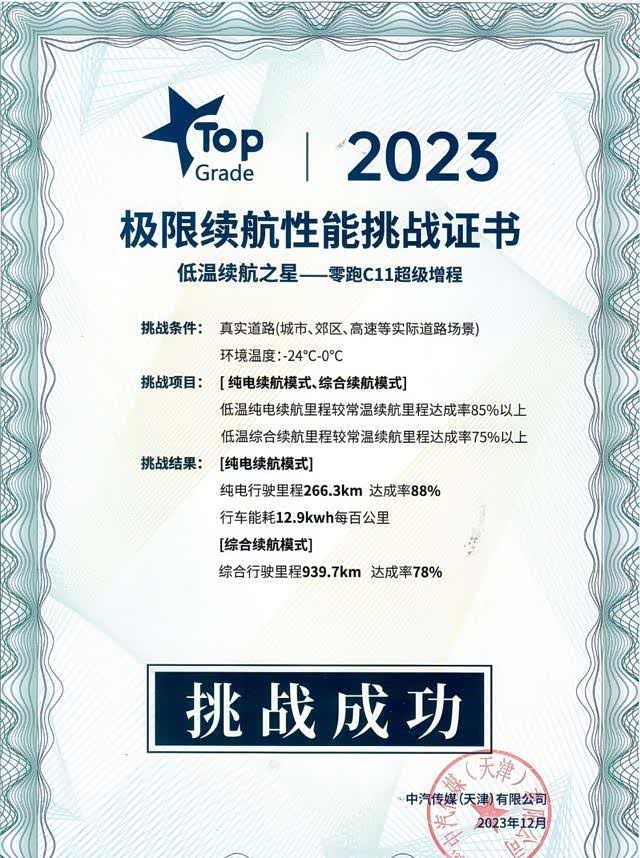 关于冬季续航测试结果,零跑C11增程版车型在0至-5℃的城市道路环境下,纯电行驶里程达到了266.3km,纯电续航达成率为88%;而在0至-24℃的综合长途道路环境下,其综合行驶里程更是达到了惊人的939.7km,续航达成率为78%。这一成绩令人瞩目,引发了不小的关注。