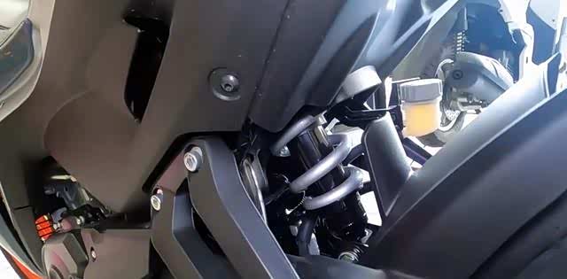 前悬挂采用传统正立式油压前叉,后悬挂采用中置单枪弹簧避震,预载可调。制动方面采用前后碟刹车。仪表方面,采用一块带档位显示的负显液晶仪表。