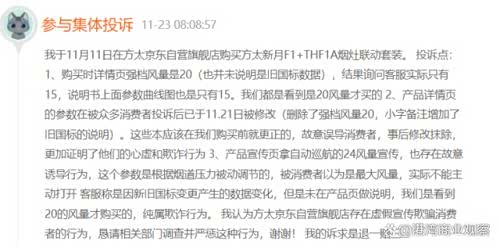 在黑猫投诉平台,有关方太F1油烟机虚假宣传,一时之间刷了屏。对于客服的解释,不少消费者认为,新旧国标对风量定义完全相同,只是新国标明确了最大风量的定义前提,且新国标已于2022年12月30日发布,在迄今11个月的时间方太旗舰店均未更新详情页,仍然存在糊弄消费者的嫌疑。