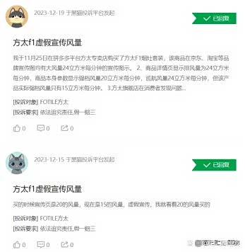 2023年11月及12月,在黑猫投诉网站,有几十名消费者发帖表示,自己购买的方太新月F1灶具套装存在虚假宣传的情况。