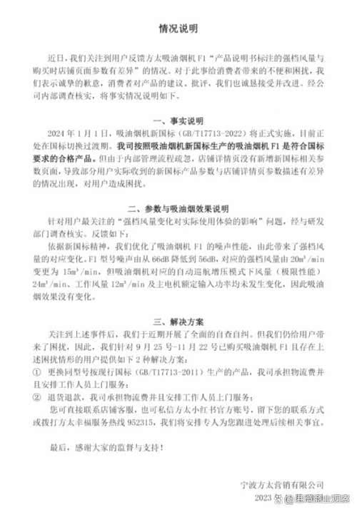 在一系列连环操作下,11月23日,对于用户反馈的方太吸油烟机“因产品说明书标注的强档风量与购买时店铺页面参数有差异”,方太集团表示,吸油烟机新国标将正式实施,目前正处在国际切换过渡期。我司按照吸油烟机新国标生产的吸油烟机F1是符合国际要求的合格产品。但由于内部管理流程疏忽,店铺详情页没有新增国标相关参数页面,导致部分用户实际收到的新国标参数与店铺详情页参数描述有差异的情况出现,对用户造成困扰。