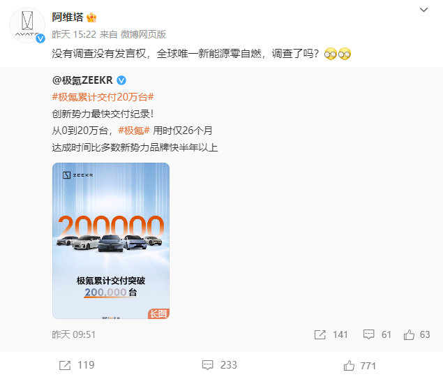 随后阿维塔官方选择正面硬刚,转发极氪博文时表示“没有调查没有发言权,全球唯一新能源零自燃,调查了吗?”
