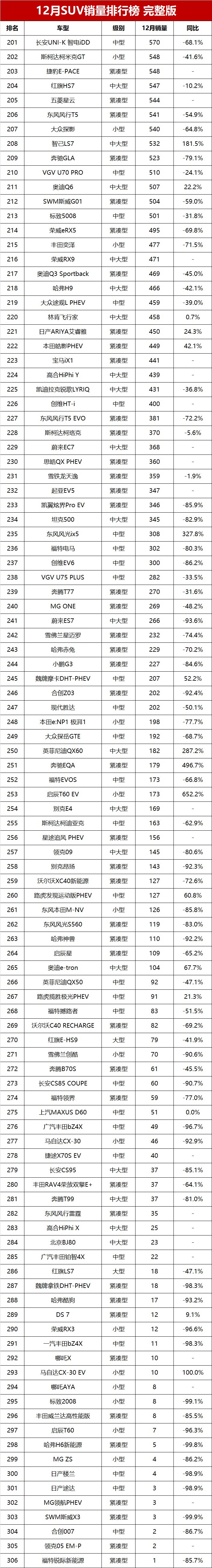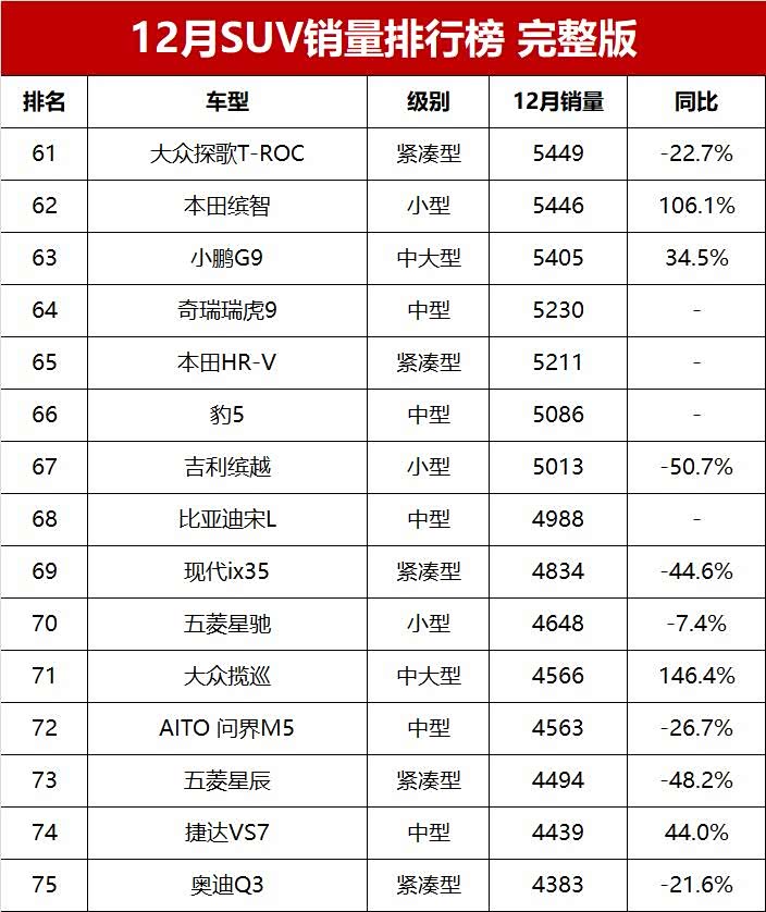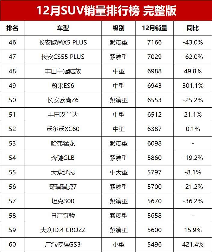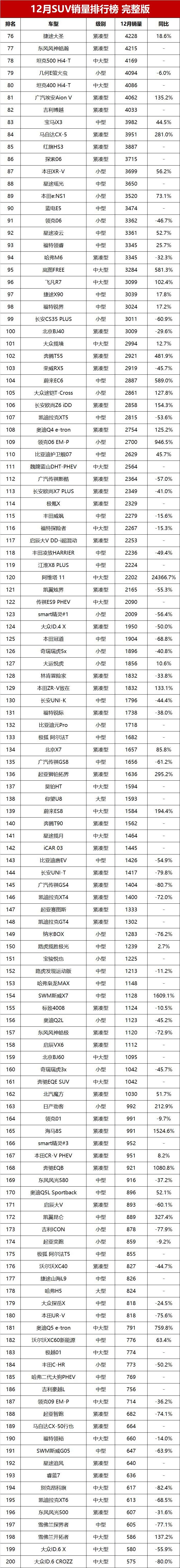 12月份销量破万辆的SUV达到31款车型,其中12款车型销量超过2万辆。新能源成为SUV市场的引领者,在销量超过2万辆的12款SUV中,新能源占据7款车型,并牢牢霸占SUV销量榜的前四名;特斯拉Model Y一枝独秀,首次有中大型SUV销量突破2万辆大关;合资燃油SUV年底销售火爆,以本田CR-V、丰田RAV4为代表的合资燃油车销量完胜国产燃油SUV销量之王长安CS75 PLUS和哈弗H6,大众途观L则夺得燃油中型SUV销量冠军。