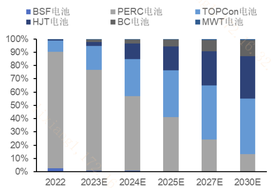 八、光伏技术迭代:N型替代P型趋势深化,TOPCon或将成为行业主流,HJT规划产能初步启动,PERC逐步退出历史舞台,用高质量竞争对抗产能过剩。