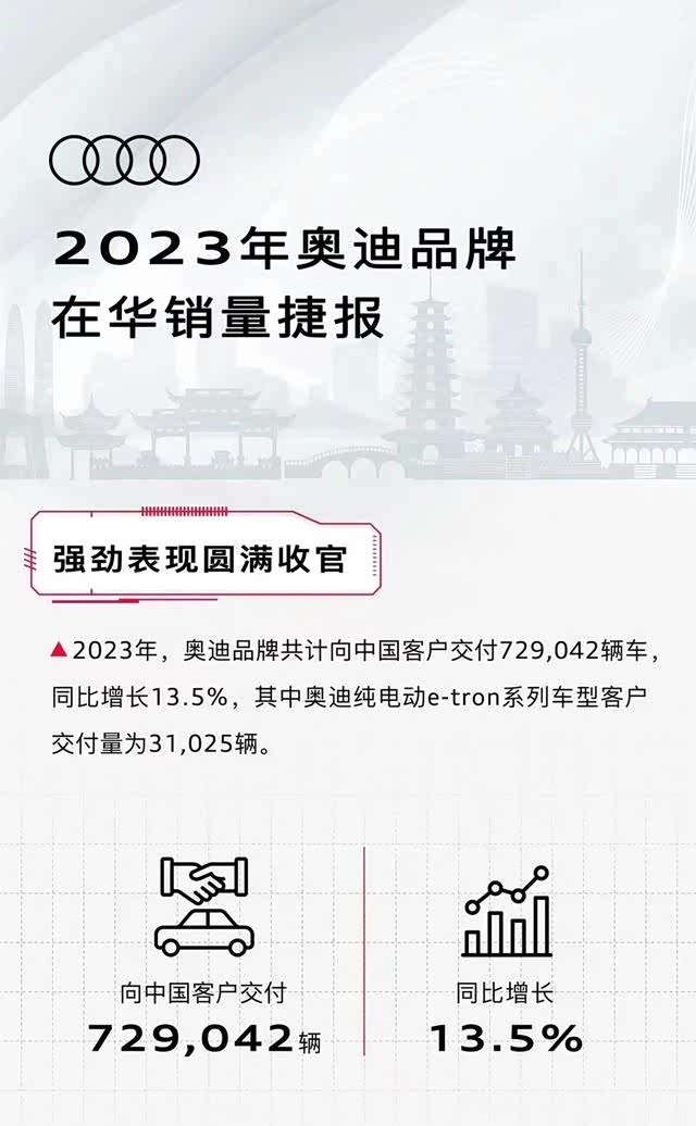 奥迪2023年在华销量729042辆(同比增长13.5%),以上销量包含国产奥迪+进口奥迪