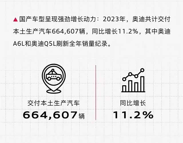 2023年奥迪国车型销量664607辆(同比增长11.2%),占奥迪在华总销量的91.2%。