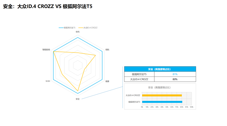 再看一汽-大众ID.4 CROZZ,国内消费对大众的安全印象分还是很高的,虽然在近几年也有大大小小的事件减掉了一些分数,但整体表现还是很不错的。在被动安全上,一汽-大众ID.4 CROZZ其高强度钢和铝合金车身的占比为80%、热成型钢材料占比达到28%,略低于阿尔法T5,并且因为车身结构上的差异,其车身扭转刚度(阿尔法T5为47119 Nm/deg,ID.4 CROZZ为37000 Nm/deg)较阿尔法T5也要低了不少。