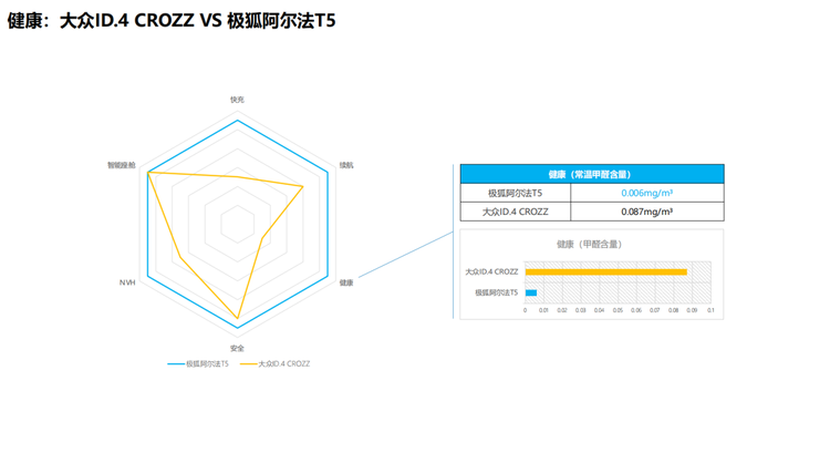 另外需要特别说明的是座舱健康方面,极狐品牌绝对算是最有代表性的品牌,旗下的亲子车考拉让人印象深刻,阿尔法T5也维持了这样的高标准。内饰用料极为考究,内饰表面添加了中科院独家黑科技的吸附降解材料,持续分解甲醛、苯等有机化合物,以及细菌、病毒、霉菌、螨虫等有害物质。根据实测,极狐阿尔法T5在常温状态下的甲醛含量低至0.006mg/m³,在50℃高温环境下,经4小时暴晒后,依然低至0.06mg/m³,而一汽-大众ID.4 CROZZ在常温状态下的甲醛车内甲醛平均值就达到了0.087mg/m³,确实是相差巨大,也不得不表扬极狐阿尔法T5对家人健康的重视。