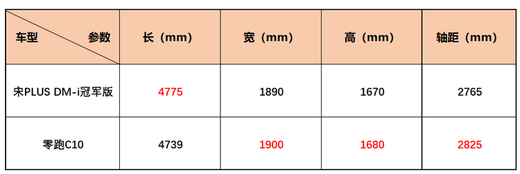 车身尺寸方面,宋PLUS DM-i冠军版的长宽高分别是4775/1890/1670mm,轴距为2765mm,定位紧凑型SUV;而零跑C10的长宽高分别达到了4739/1900/1680mm,轴距为2825mm,定位中型SUV。从定位上来看,零跑C10比宋PLUS DM-i冠军版大一个级别,在宽度、高度尤其是轴距上更有优势,内部空间也更值得期待,不过宋PLUS DM-i冠军版的车长反而更长。