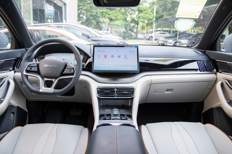 内饰方面,宋PLUS DM-i冠军版同样沿用了经典的家族式设计,了解比亚迪车型的朋友会有一种很熟悉亲切的感觉,而且它的配色和用料也都比较不错。中控区域匹配了12.3英寸全液晶仪表盘和12.8英寸悬浮式中控屏,三辐式方向盘以及海豹同款水晶电子挡杆,看上去更显年轻,也更有质感。
