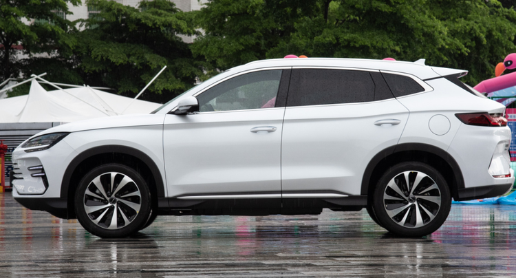 宋PLUS DM-i冠军版的侧面线条非常流畅,层次感和力量感更为突出,贯穿式腰线从前灯组一直延伸到尾部,并且在C柱部位有着上扬式设计,轮眉和侧裙部分配备有黑色饰板,下方还搭配了19英寸多辐式造型轮毂,风格更显大气。