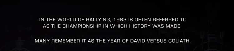 而片中的故事,就发生在WRC B组最富传奇色彩的1983年,一如片头序幕中这样写下的——“在拉力赛的世界里,1983年被称作是创造历史的一年。”