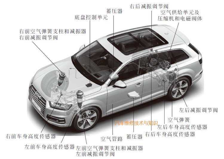 首先,什么是空气悬挂系统呢?简单来说,它是一种利用空气压缩机和蓄压器来调节车身高度和弹性的悬挂系统。空气悬挂的结构主要包括空气压缩机、蓄压器、控制单元、前后桥车身高度传感器等部分。其中,空气压缩机的作用是产生压缩空气,为系统提供所需的气源;蓄压器则用来储存和释放空气压缩机产生的压缩空气,以保持系统的压力稳定;控制单元是整个系统的“大脑”,负责接收传感器信号、处理控制指令并调节悬挂系统的状态;前后桥车身高度传感器则负责监测车身高度变化,并将信号传送给控制单元。