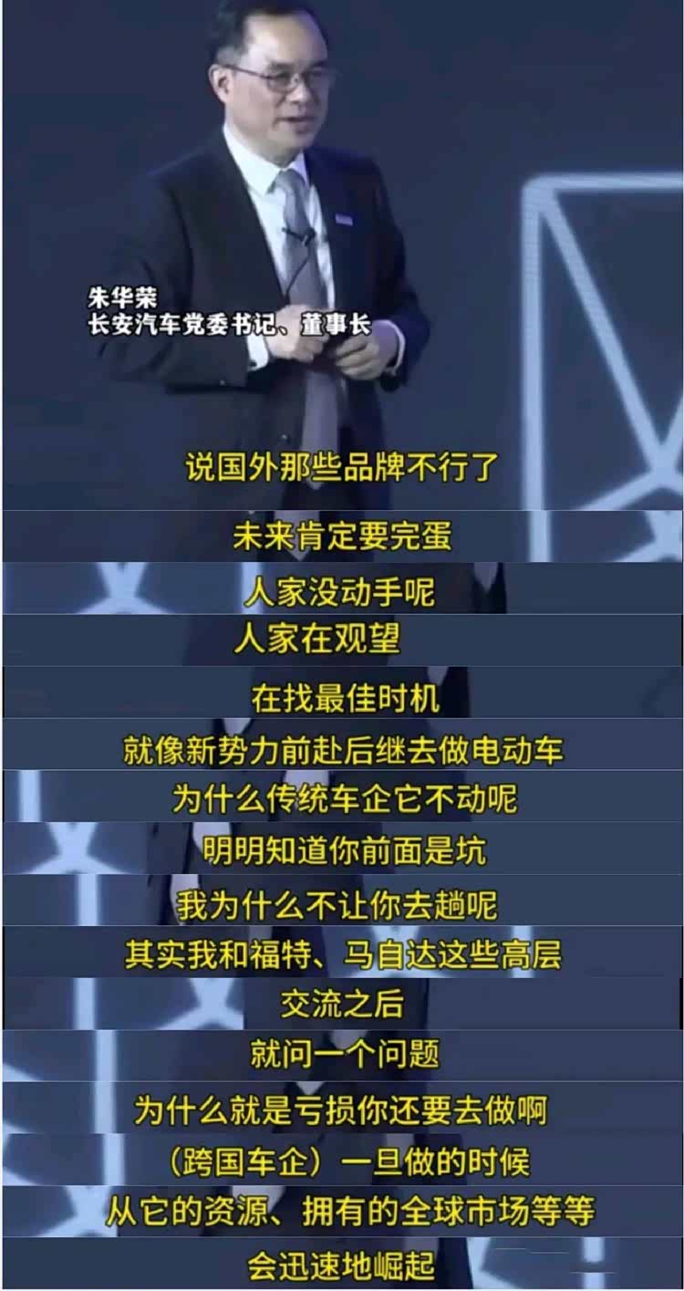 在大会上,朱华荣称“说国外那些品牌不行了,未来肯定要完蛋,人家没动手呢,人家在观望,在找最佳时机,就像新势力前赴后继去做电动车,为什么传统车企它不动呢?明明知道你前面是坑,我为什么不让你去趟呢?”
