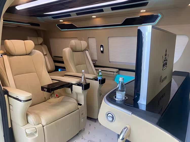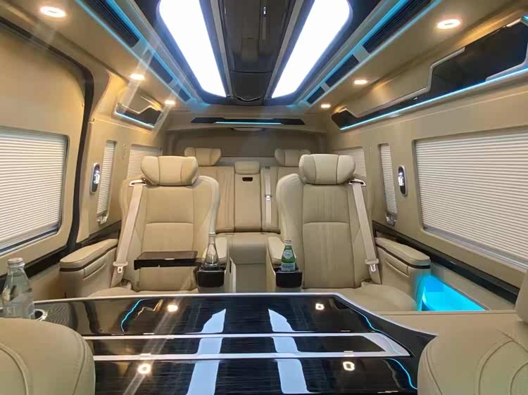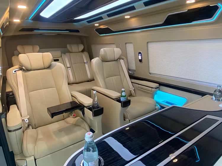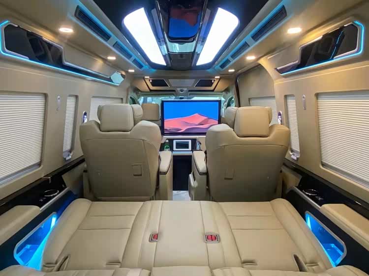丰田海狮整车(华通丰业)升级了加强型的隔音隔热处理,车内带空气净化系统,无线充电系统。在进门侧加装了氧化铝脚踏带迎宾灯的,整车都是采用纳帕级皮质进行包覆的,侧壁桃木装饰,手动百褶窗帘,后舱暖风系统,最后说说棚顶灯光,这个有智能触摸控制系统。灯光超级棒。