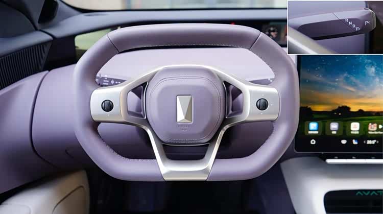 为了不遮挡顶部视线,采用了小尺寸近矩形方向盘,真皮材质手感舒适。横辐两侧都采用滚轮控制,可以四向调节和按压控制,与特斯拉操作方式相同。右后方提供电子怀挡,实现上车即上电。