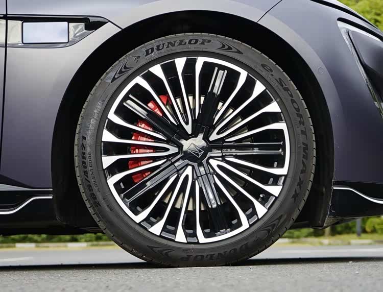 这台车选装了21英寸光束多辐运动轮圈和Brembo全铝四活塞珊瑚红定钳,不仅视觉上运动提升很多,实际刹车效果也强化不少。轮胎规格为265/40 R21,胎宽足够,匹配邓禄普eSport Maxx系列产品,有良好的抓地性能和静音效果。