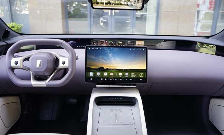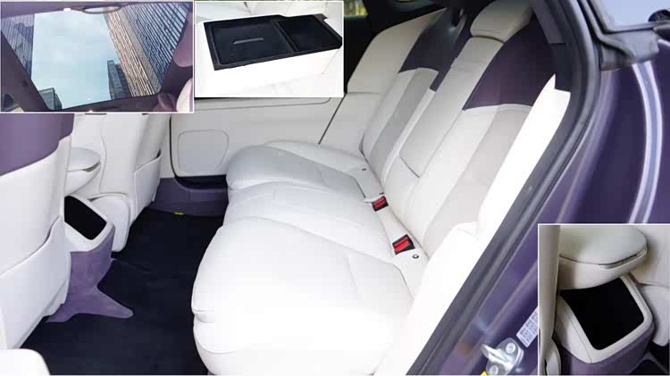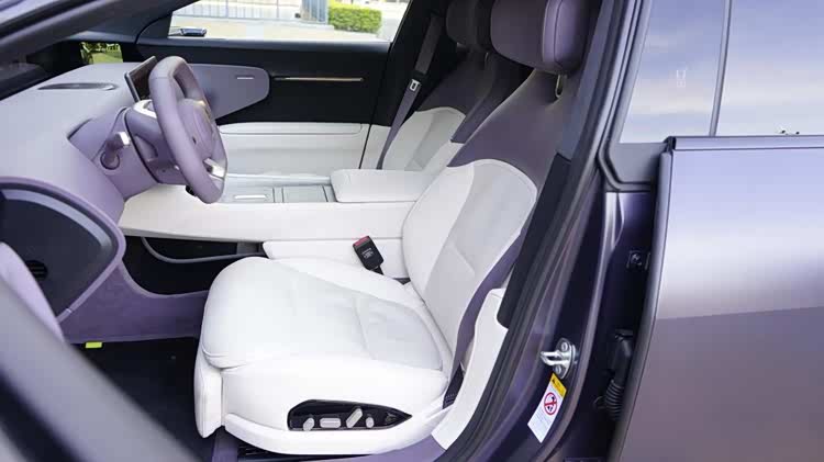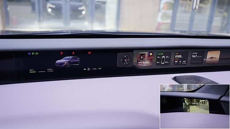 车厢内部也很有创新感,淡紫色内饰显贵气。位于台面前方的环绕式远端屏起到仪表屏的作用,中央的卡片内容可自定义,两侧是电子后视镜的显示屏,一般人大约驾驶15分钟即可适应。主要交互通道是中央的15.6英寸中控屏,有很高的集成化,车厢基本没有实体按键,扶手台成为纯粹的储物空间。