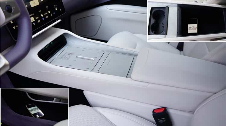 扶手台全部用来储物,前方出风口位置较低,需要注意小物品掉落。双手机位是木纹底板,在放置手机时会自动下沉,起到限滑的效果,比较巧妙,支持50W无线快充。后方滑盖下是双杯架,扶手箱空间方正,有相当的容积。下方悬浮空间高度可观,也能放置不少小物品。需要注意的是,玻璃升降键布置在屏幕下方,还真需要适应。