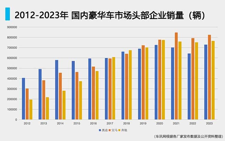 2012年,奥迪在华销量已经超过40万辆,在国内豪华车市场遥遥领先。跟随其后的宝马在华销量也超过30万辆;而此时的梅赛德斯-奔驰,在华销量不到20万辆,不及奥迪的二分之一。