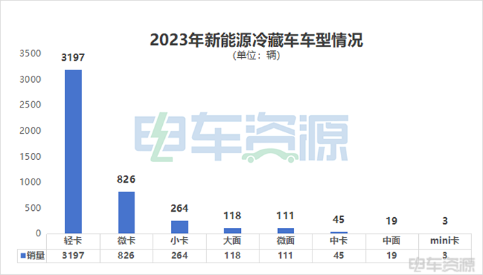 那么,2023年新能源冷藏车具体销量如何?哪些车型最受市场欢迎?电车资源对此做了数据统计,2023年我国新能源冷藏车总销量为4583辆,同比增长56.9%,卡系车型依然是主流车型,VAN系车型刚刚起步。其中轻卡车型3197辆,占比69.8%。