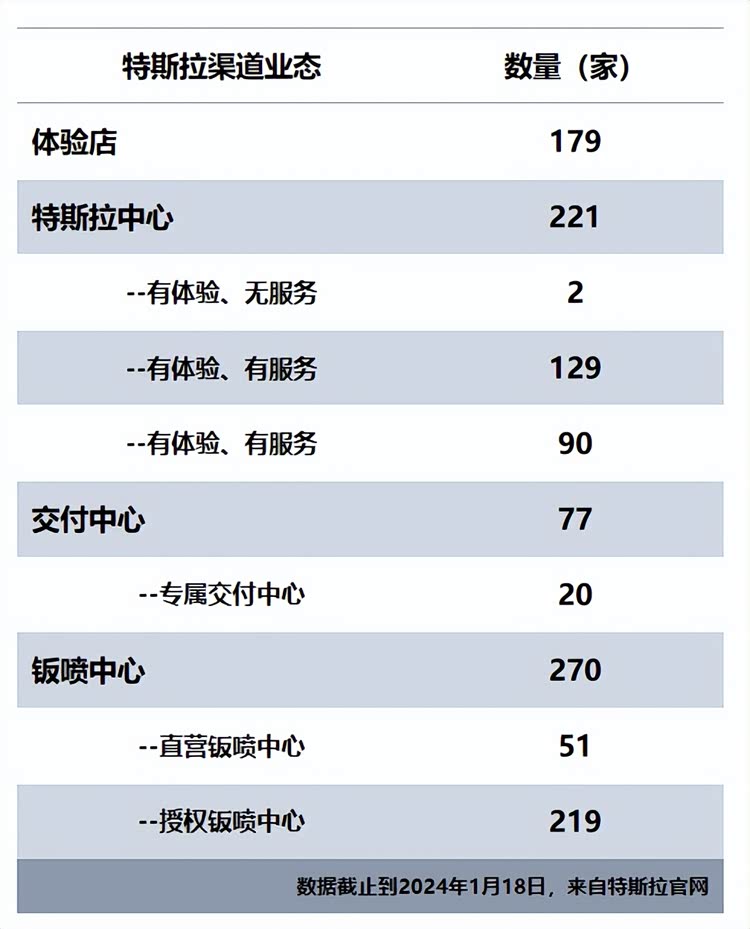 体验店:特斯拉把位于购物中心的商超店,称为体验店。这些店都不含售后服务,主要功能是为消费者提供汽车展示、体验、试乘试驾等服务;特斯拉商超店现有179家。