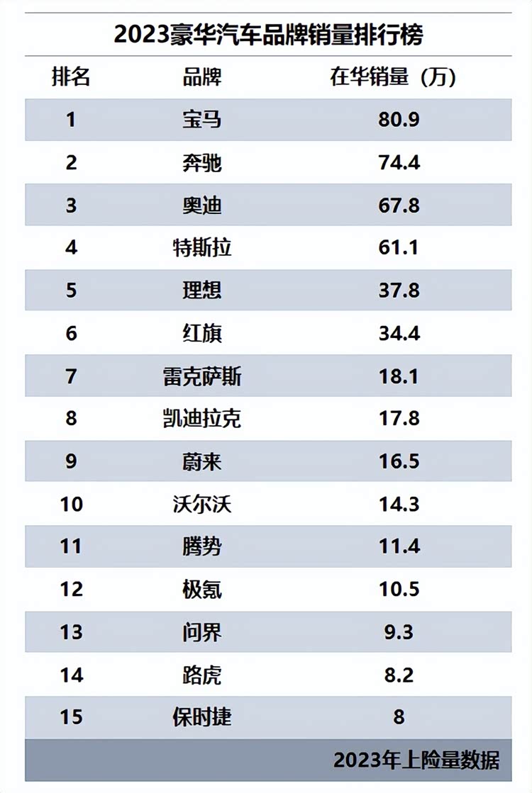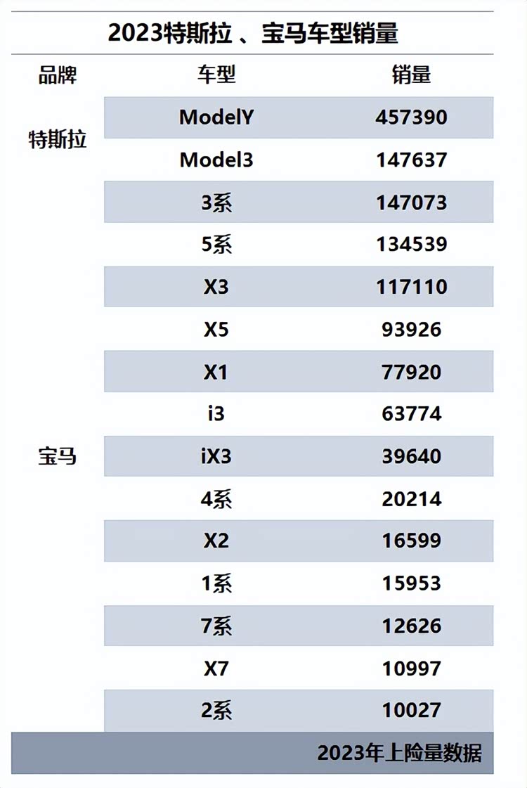 我们从2023年上险数据得知,特斯拉主销车型(年销量过万)只有两款,而宝马主销车型(年销量过万)则有13款,我们可以看一下如下表格: