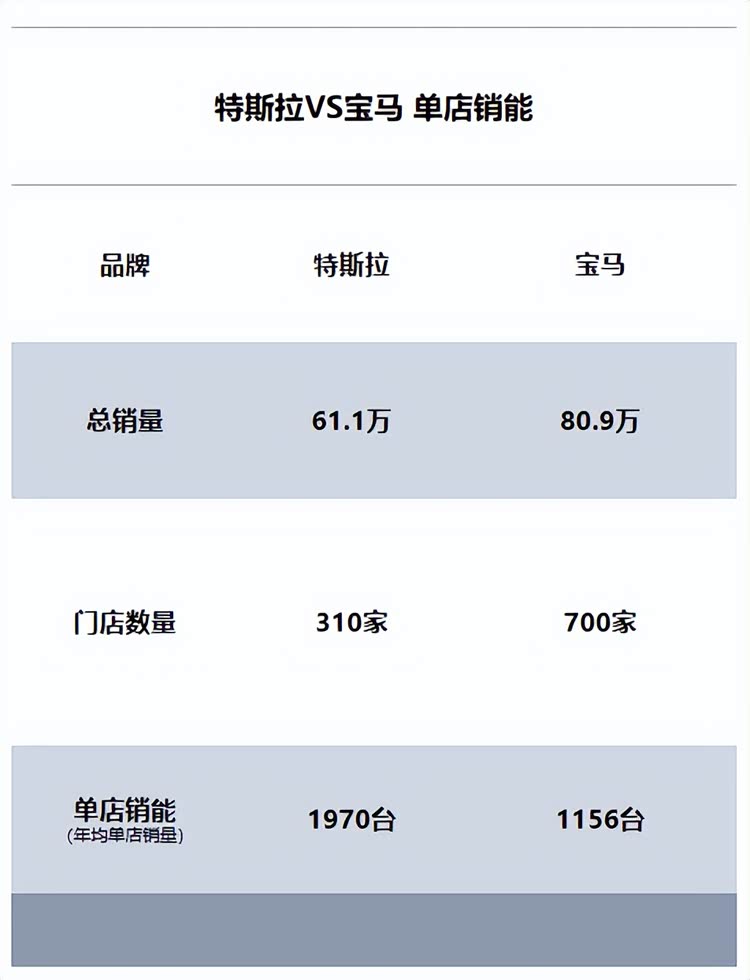 大的店面就要更多的运营团队,所以我们去特斯拉店,销售顾问及工作人员都相对较少,而宝马4S店员工数量则是特斯拉的好几倍。如果从人均销能来计算,特斯拉更是遥遥领先。