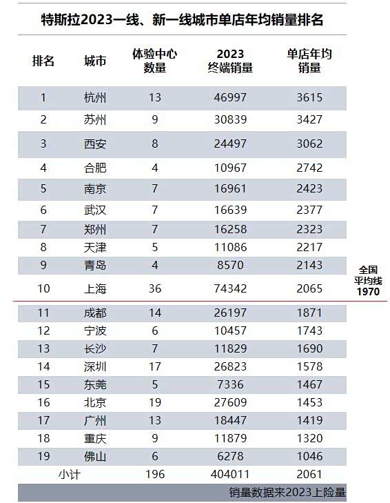 特斯拉19个一线、新一线城市的单店平均年销量为2061台,略微高于其全国平均单店年销量(1970台),其平均单店年均销量最高的城市为杭州。