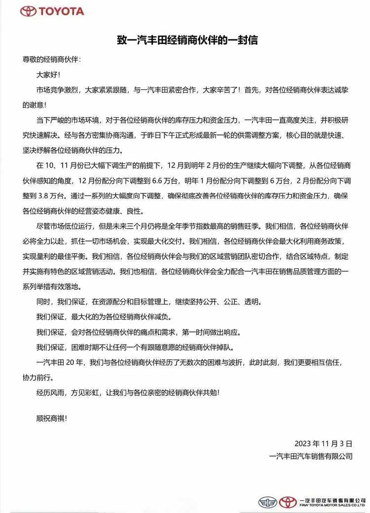 信中表示:一汽丰田将在10月、11月大幅减产的基础上,继续在此后的三个月中下调配分,直至明年2月份配分下调至3.8万台。信中不乏鼓励经销商、相互信任和共度难关的语气。