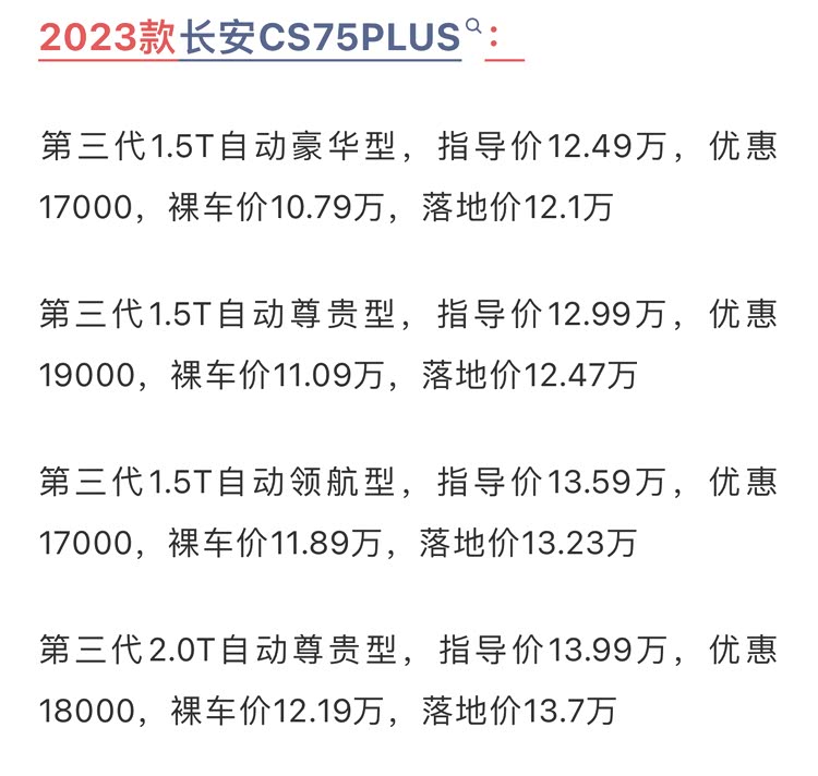 分享一下年底长安CS75 PLUS的真实行情,1.5T豪华型和自动领航型现在能下1.7个,落地分别在12.1万和13.2万左右。而1.5T的尊贵型优惠幅度最高,能下1.9个,裸车11个出头,落地不到12.5个。2.0T的尊贵型现在终端能下1.8个,落地在13.7个左右。贷款的话,总落地价最多再加三到五千元。