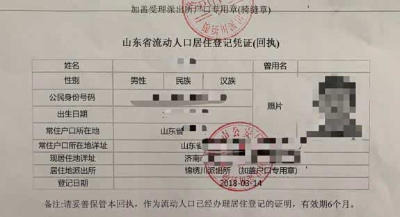 另外一种,户口没有迁回来那要怎么办过户呢?这就需要有济南暂住证了,根据派出所的相关规定,济南居住证卡片办理的话需要6个月以后出证,但你是过户不可能等到6个月,你就可以先办理暂住证证明也可以用来过户,(山东省流动人口居住登记凭证回执)有了这个暂住证明过户就方便多了。下面给大家上图: