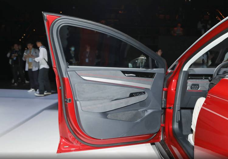 门板部分,同样采用了简洁的设计语言,与中控台相呼应。门板表面同样覆盖了软质包覆材料,触感舒适。门板下方设有储物格,方便存放物品。红色的线条和中控台做到了统一,增强了视觉冲击力。
