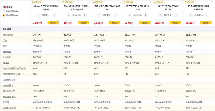 大众ID.7 VIZZION作为一款中型车,其最强大的对手莫过于特斯拉Model 3了,先从定价方面来看,大众ID.7 VIZZION的指导价范围为22.7777-26.2777元,而特斯拉Model 3的指导价范围为26.14-29.74万元,两者的差价在3-4万元,从定价来看,大众ID.7 VIZZION具备成为爆款车型的价格基础。