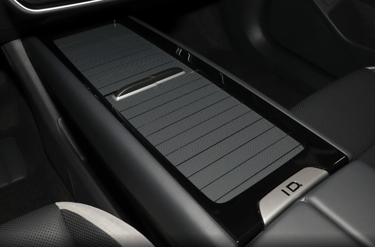 中间连接处设计简洁、精致,各个部件之间缝隙均匀,展现了极高的工艺水平。前后双盖板的设计,可以让用户自由选择哪部分开启,哪部分关闭,由于这里没有设计档把,所以非常整洁,前段盖板下面是两个手机凹槽和无线充电面板,后方则是储物盒和手机杯架。