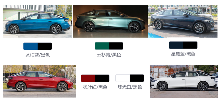 大众ID.7 VIZZION在外观方面为用户提供了五种色彩搭配,五种颜色各有特点,其中星黛蓝和白色是最为常见的配色,也是最适合大中小消费者的配色,而蓝色、青色和红色则是比较适合一二线城市的用户,既能够凸显个性和年轻朝气,而且还不会显得尴尬,能够被大众接受。而且值得注意的是,五种配色均与黑色做了拼接设计,提升了视觉效果。