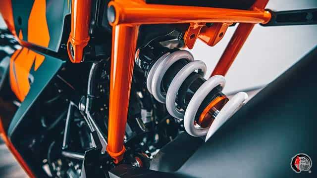 虽然车身配色换装了竞技感更强的蓝色涂装,但经典的橙色车架依然醒目。据悉,新款车型的车身结构相比上代车型重量又轻了1.5kg,操控表现更加出色。骑行三角也参考MOTOGP而设计,车把提供了10mm的调节空间,座椅高度824mm,油箱容量13.7L,百公里油耗3.46L。