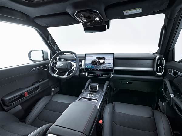 内饰方面,新车保持了捷途旅行者的设计风格,采用横平竖直的线条,配备全液晶仪表盘和大尺寸中控屏。高通8155芯片的加入提升了智能体验,未来还将通过OTA升级银龙之翼主题车机。