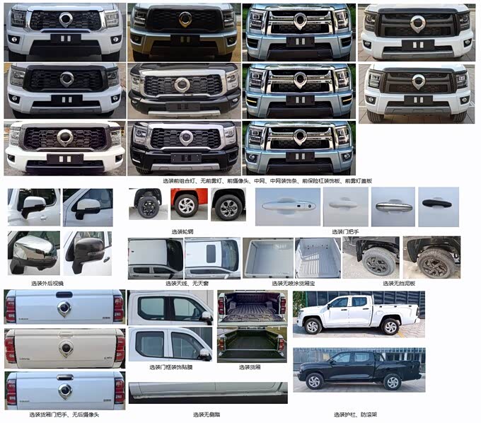 新款金刚炮支持选装前组合灯、无前雾灯、前摄像头、中网、中网装饰条、前保险杠装饰板、前雾灯盖板、轮辋、门把手、外后视镜、天线、无天窗、无喷涂货厢宝、无挡泥板、门框装饰贴膜、货厢、货厢门把手、无后摄像头、无侧踏、护栏、防滚架等配置。