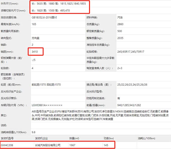 整车总质量2860kg,额定载质量500kg,整备质量2035。前轮距1570mm,后轮距1570mm,接近角/离去角分别为25/22°、26/23°、24/25°、26/26°,配备防抱死系统,前后悬长度分别为940/1285、943/1282mm。新款金刚炮搭载型号为GW4C20B的2.0T汽油发动机,最大功率145kW,最高时速165km/h,百公里油耗为9.8L/100km。