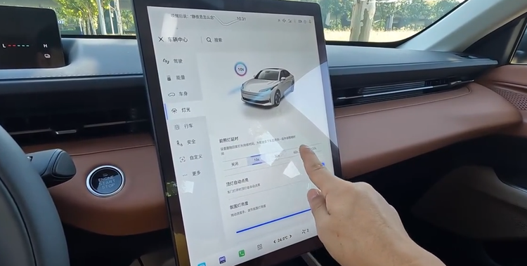 在夜间用车过程中,这款车配备的“伴我回家”功能是比较实用的,在车辆中心-灯光内,就有前照灯延时功能,可以选择10秒、30秒等时间。当晚上回家离开车辆,如果这时候车灯立马关闭,就无法看清前方的道路情况,这时候开启这个功能,大灯就能延时关闭几十秒,不仅能照亮回家的道路环境,而且也能让车主感到安心。